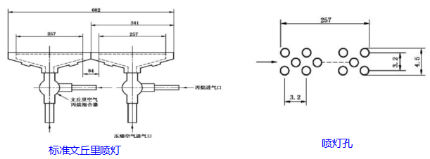 4.4.1、引燃源类型:包括一个或两个带型丙烷燃气喷灯及其配套流量计和文丘里混合器(见图五a)。其供火表面钻有242个直径为1.32mm孔径的扁平金属板,这些孔的中心距离为3.2mm,分三排交错排列,每排分别为81、80和81个,分布在标称尺寸为257×4.5mm的范围内。另外,在喷火板两侧各开一排小孔,这此导向孔可保持火焰的稳定燃烧(喷灯如图五b)。每个喷灯应配备准确装置以控制丙烷和空气流入速率。