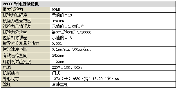 2.PC机控制软件,实现试验力、试验力峰值、横梁位移、试验变形及试验曲线的屏幕显示,操作直观简便。具有超载、过流和过压保护功能,并配有管材内径测量系统,能准确地测量管材的内径变化。传动系统通过由PC机和单片机组成的分布式控制系统控制全数字交流伺服电机,按试验标准要求的速度带动中横梁上下移动,通过试样压板对管材试样施加压力,力值检测部分采用分段线性校正方法保证了该机的高精度,高稳定性。 该系列环刚度试验机已通过欧盟产品CE认证。