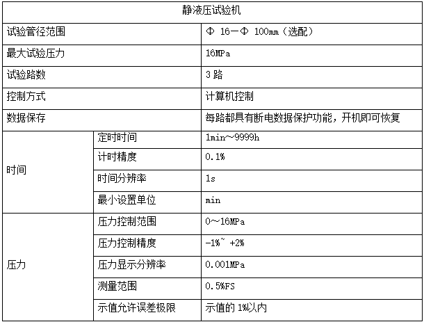 静液压试验机采用计算机嵌入式控制。模块化设计,实现单独控制。任何一路出现问题,只要把当前工位的截止阀关闭,则不会影响其他工位的正常运行,其具有管材破裂识别、实时监控、来电数据恢复、打印、存储试验结果、试样预处理设置等功能,并根据国家节假日的需要,可以存储7天的数据。