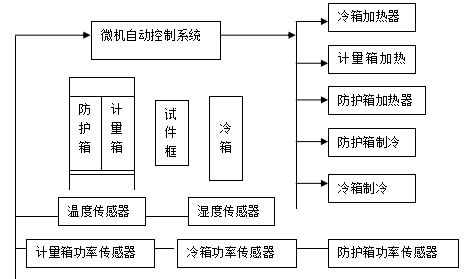 冷箱的功能是在试件另一侧形成一个比计量箱温度低的稳定均匀温度场,以便在试件的两侧形成恒定的温差。它是由箱体五个壁面、导流屏、电加热器、冷风气流通道、风速传感器、温度传感器、湿度传感器、夹具组成。
