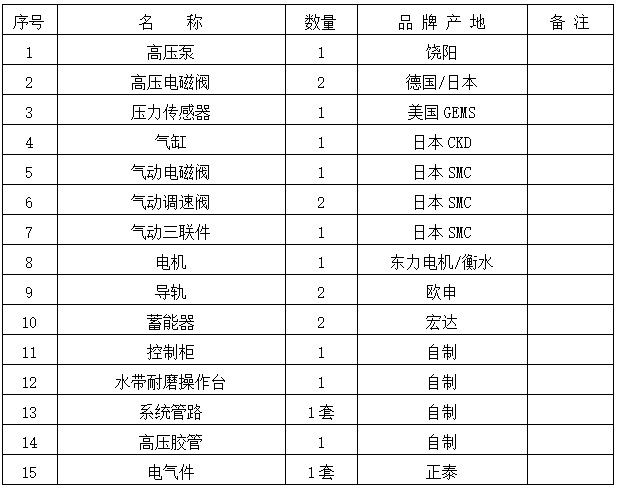 9、耐磨磨头:压力105N±5 N,行程80mm.气动往复移动速度18mm/s~21mm/s,可调,水带转速27±1转/分,根据标准磨头每个往复具有移位砂带功能,保证每个往复都有新的砂纸面接触水袋。